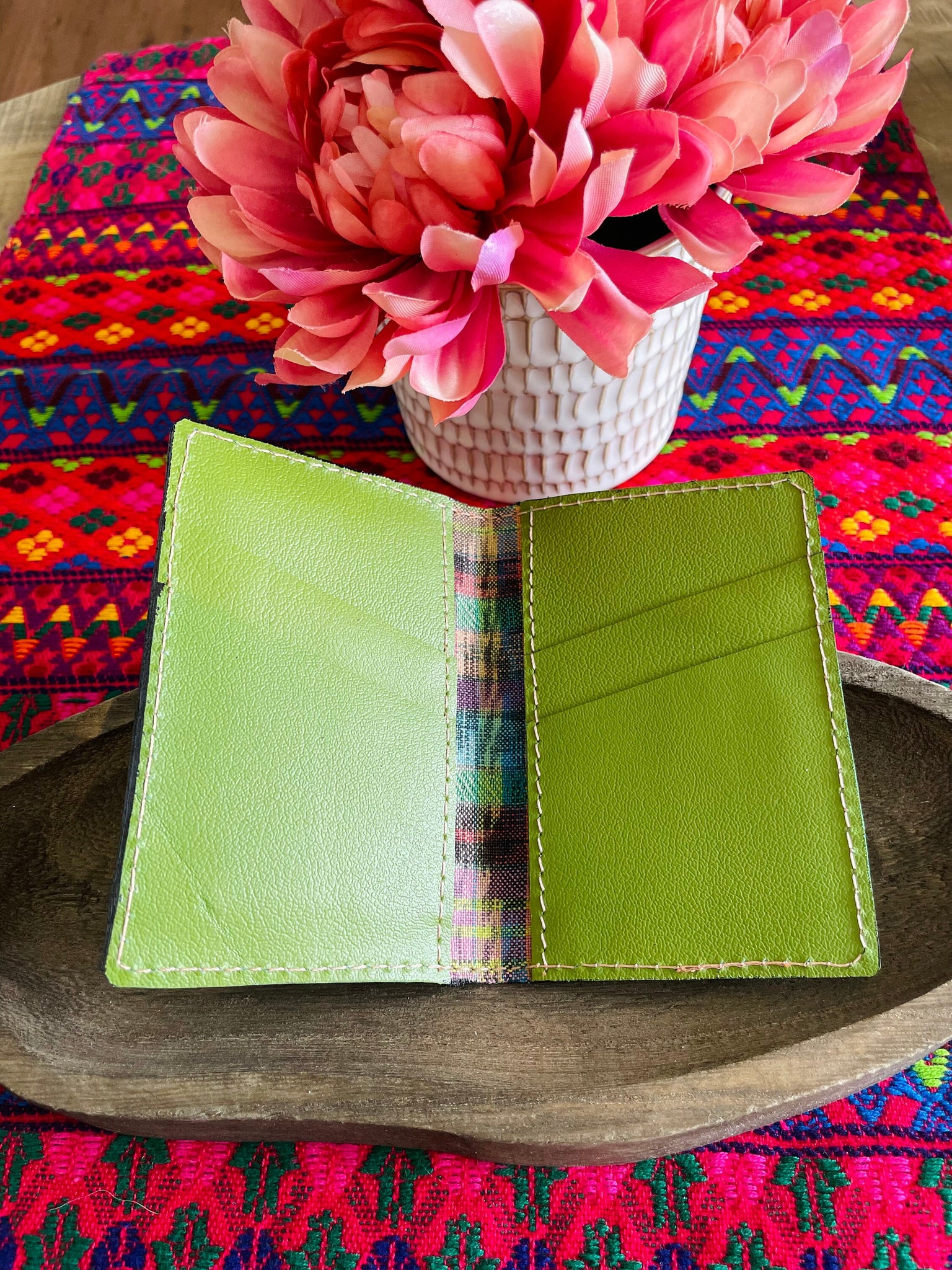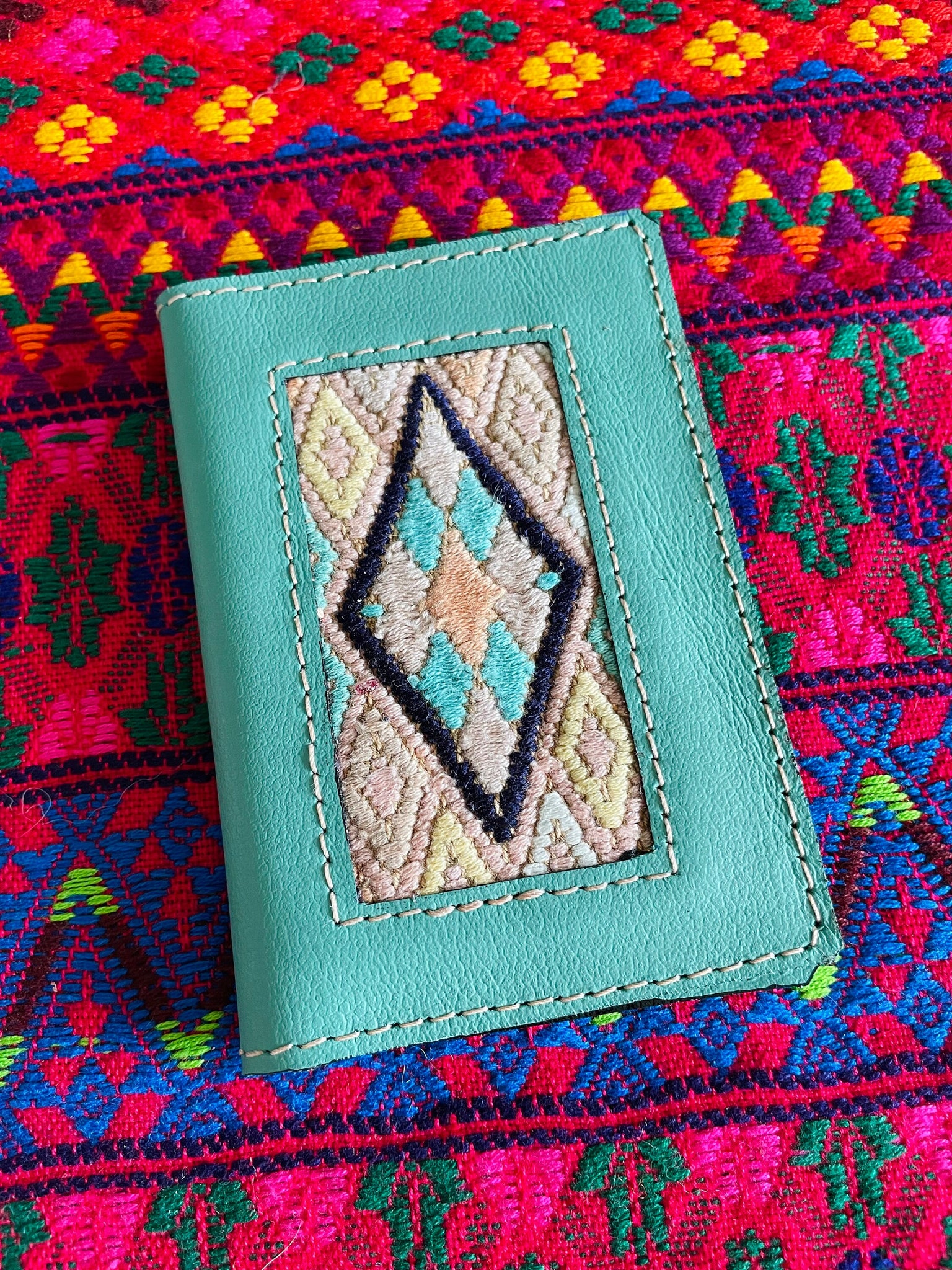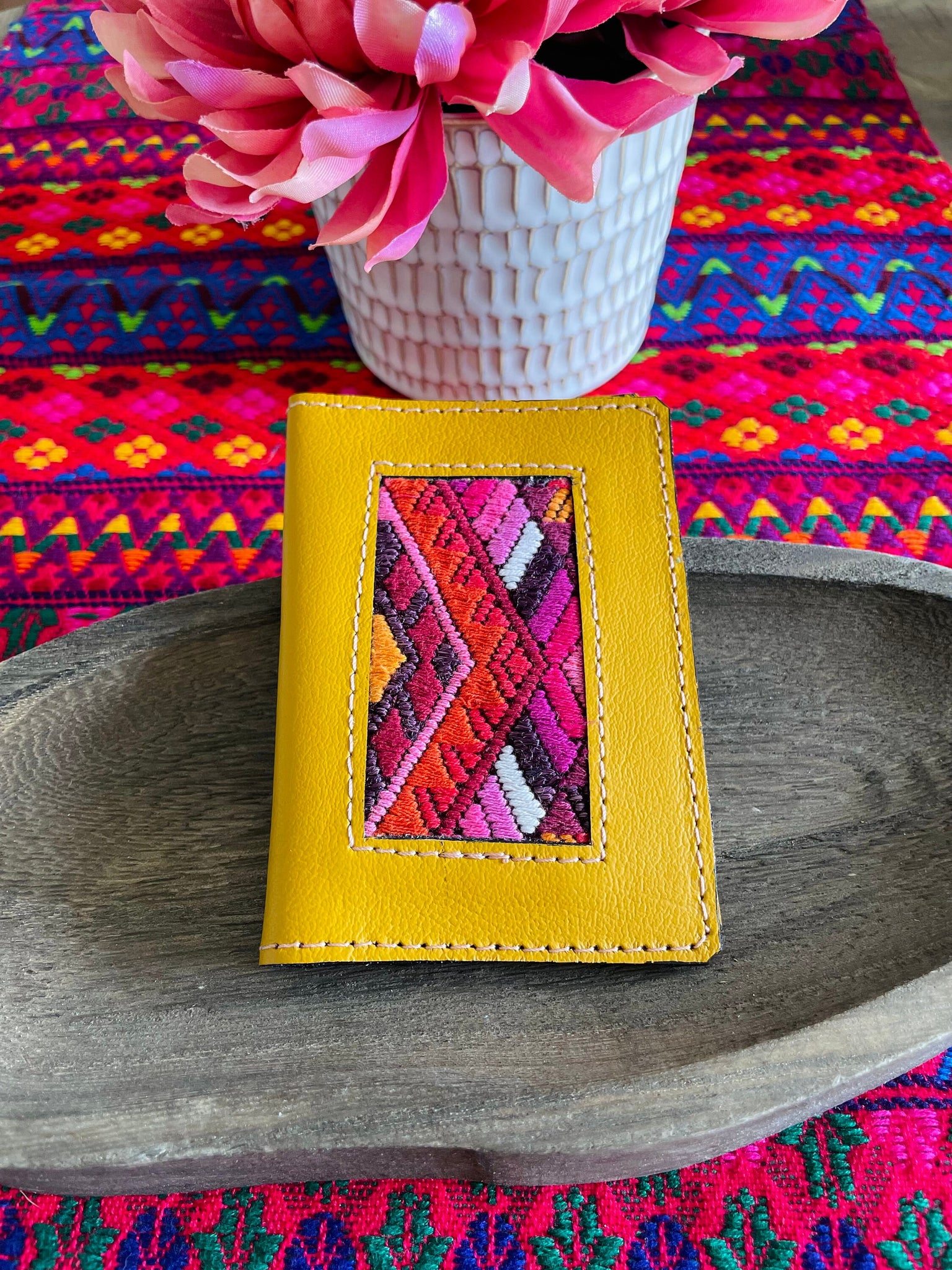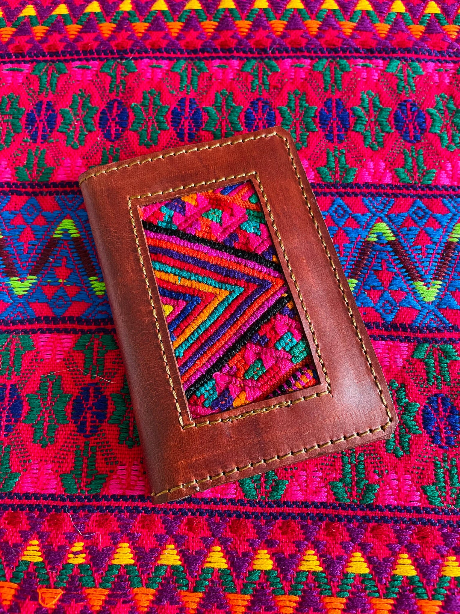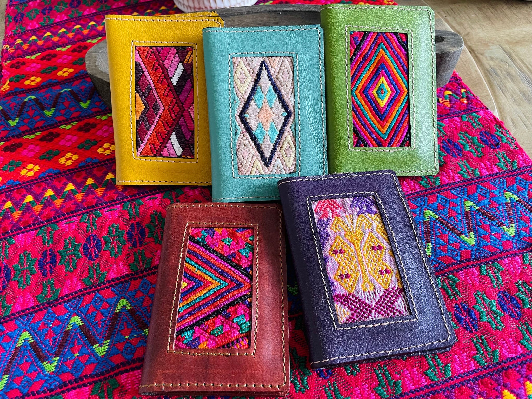 Beautiful Guatemala Mayan authentic leather card holders with huipil textile.